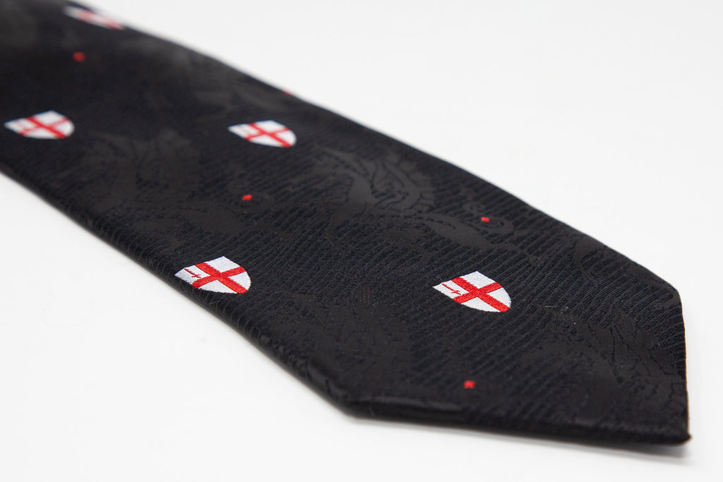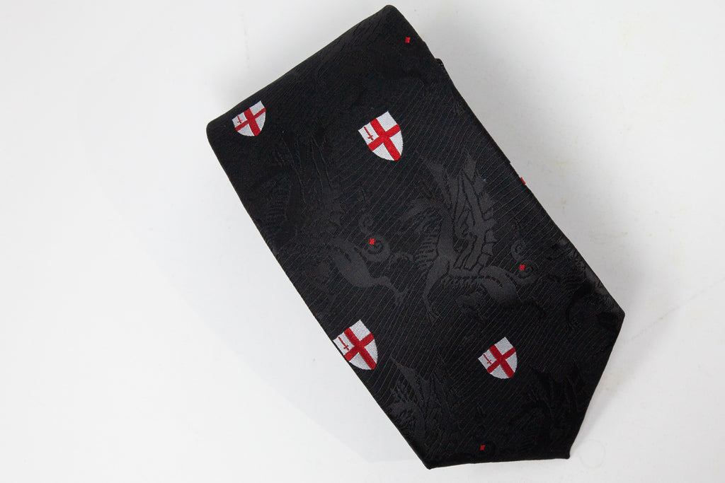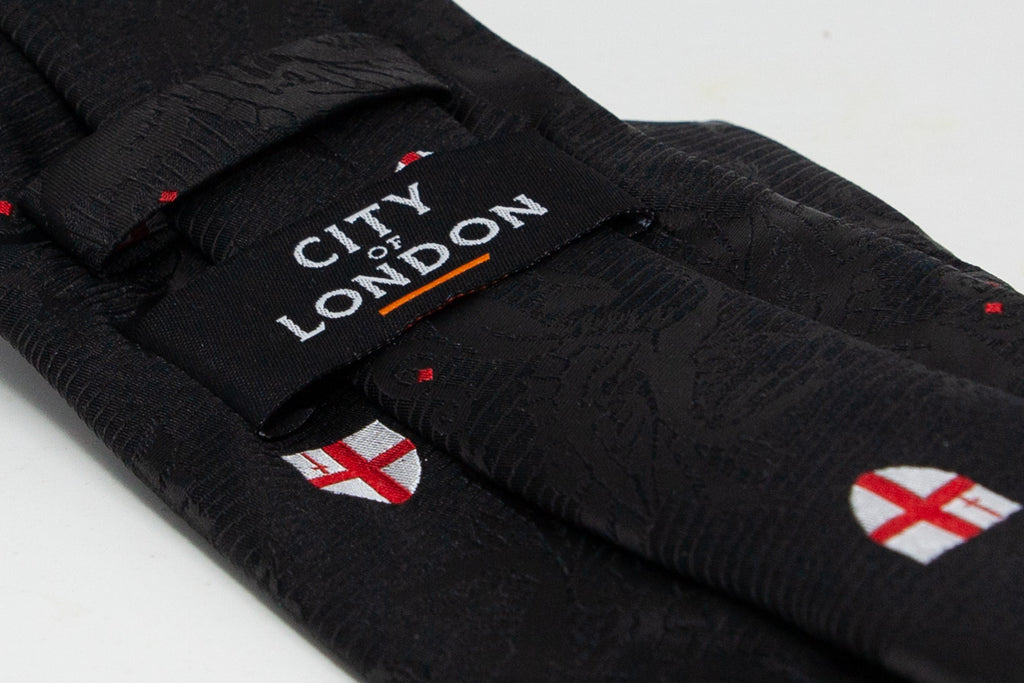 Elegant black necktie adoring the City of London shields on a background of subtly woven City of London dragons. It looks particularly good with dark suits and jackets.